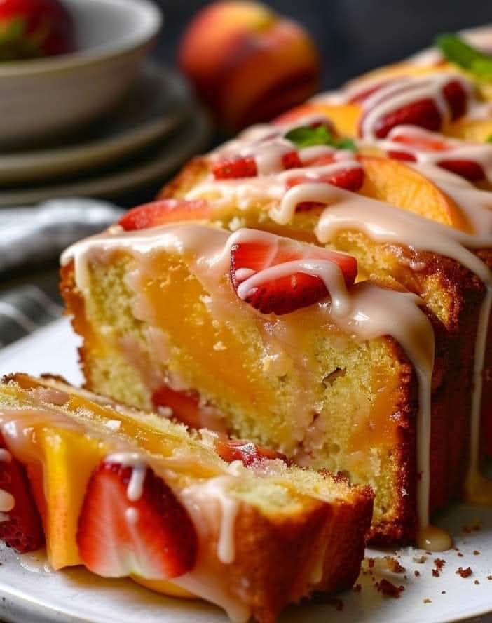 As the sun stretches longer across the sky and farmer’s markets overflow with sun-ripened fruits, there’s no better way to celebrate the season than with a homemade summer cake. This Refreshing Summer Peach Strawberry Cake blends the tender sweetness of fresh peaches and strawberries into a moist, buttery loaf — finished with a silky vanilla glaze and garnished with vibrant fruit slices and mint.