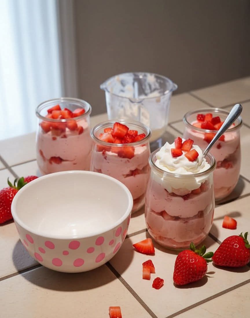 In small jars, ramekins, or dessert cups, spoon a generous layer of the cloud mixture, then add a few chopped strawberries. Repeat if desired for a layered look. You can also swirl them gently for a marble effect.