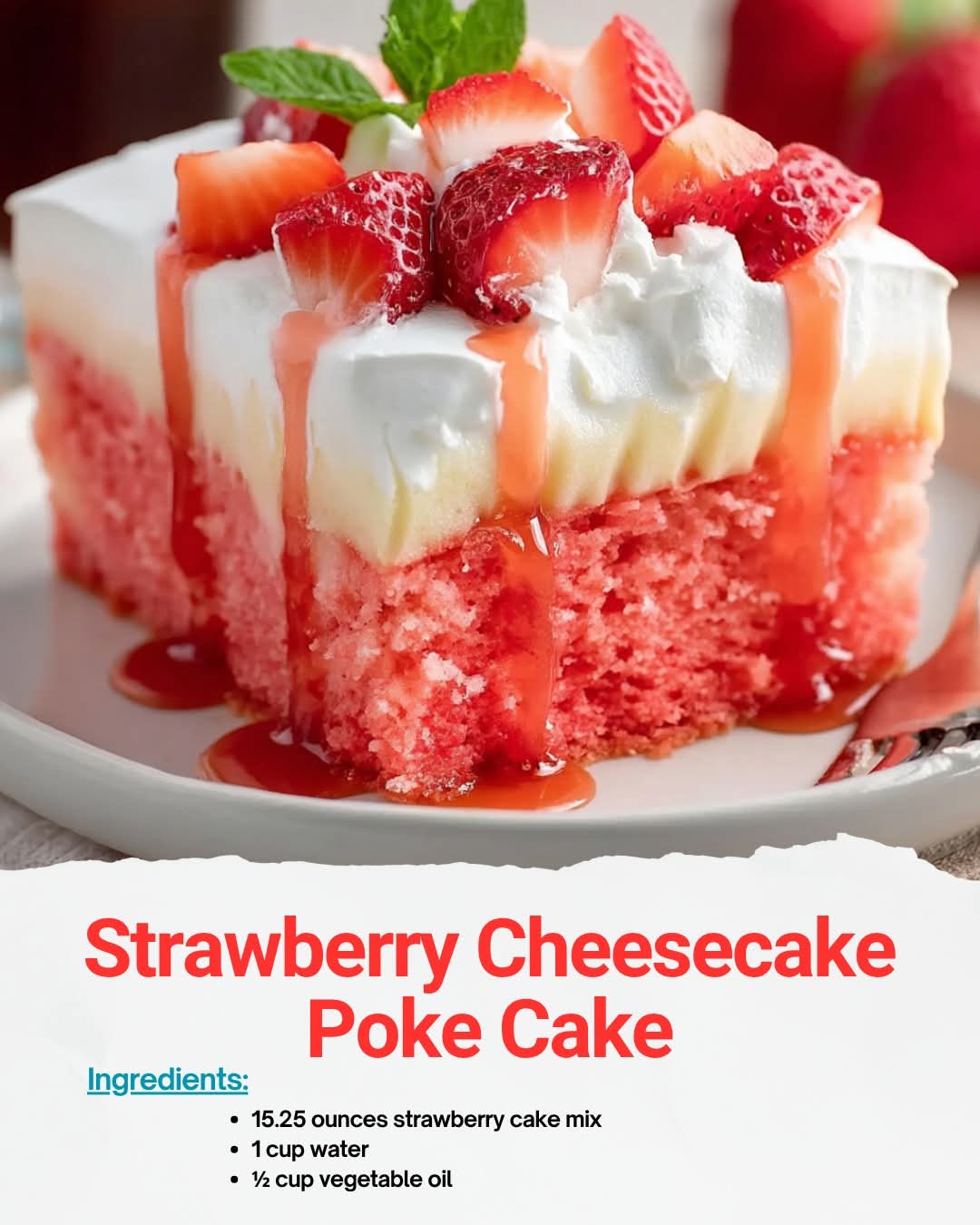The Strawberry Cheesecake Poke Cake is the ultimate dessert for anyone who craves something indulgent yet light, creamy yet fruity. It’s easy to make, visually stunning, and always a crowd-pleaser. With each bite, you get the perfect combination of moist cake, rich pudding, and fluffy cream, creating a delightful experience that will have everyone asking for seconds. Whether it’s a special occasion or just a fun treat to enjoy with loved ones, this poke cake will always bring smiles and happy taste buds.