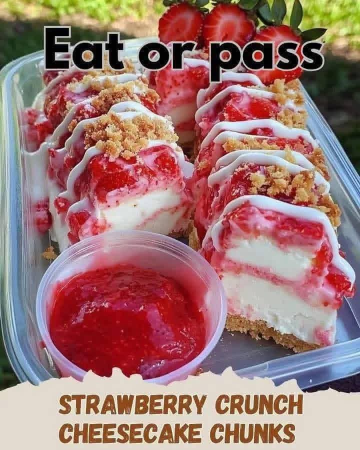From the smooth creaminess of the cheesecake to the sweet, tangy burst of strawberries and the satisfying crunch, this dessert is bound to become a new favorite in your recipe collection. Don’t forget to share the love with others, because these cheesecake chunks will definitely impress anyone who tries them!