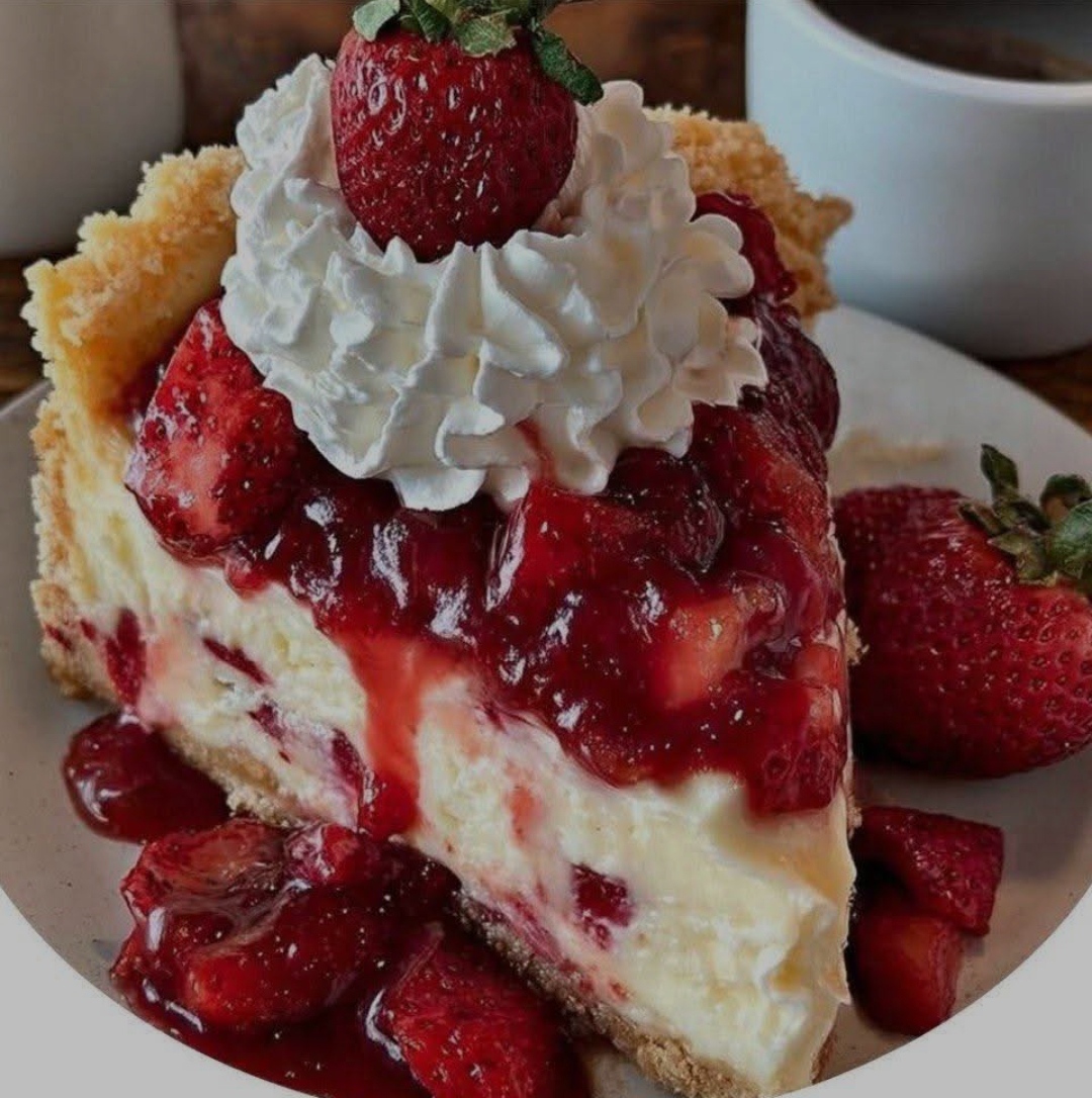 - Bottom Layer → Strawberry pie filling (juicy, fruity base)