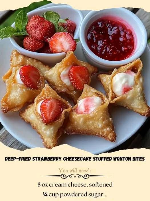 Absolutely! Let’s build an irresistible, full-length recipe story for your Deep-Fried Strawberry Cheesecake Stuffed Wonton Bites — the kind of dessert that feels like love at first bite 💘. This version includes a fun introduction, rich history, detailed instructions, love notes, and all the warm, mouthwatering emotions you’d want to tie into a dessert this special.