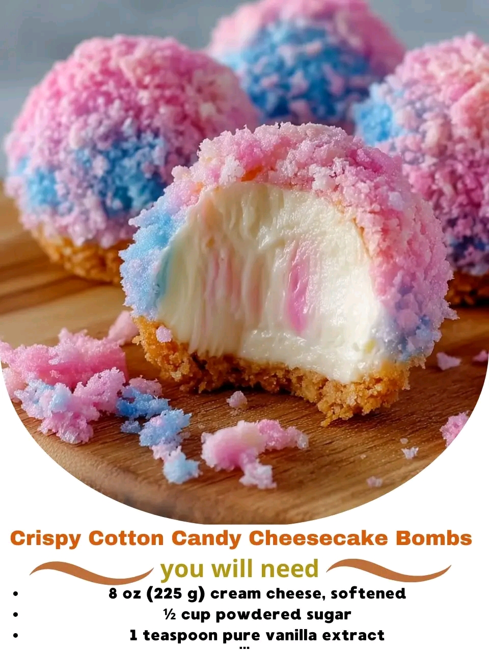 These cheesecake bombs are a delightful fusion of textures and flavors. The process begins by preparing a smooth, sweet cheesecake filling, which is then frozen into perfect bite-sized balls. The crispy graham cracker crust and cotton candy exterior add the final touches, creating a dessert that’s crunchy on the outside and creamy on the inside. The optional frying method adds another level of texture, making the bombs extra crispy and indulgent.