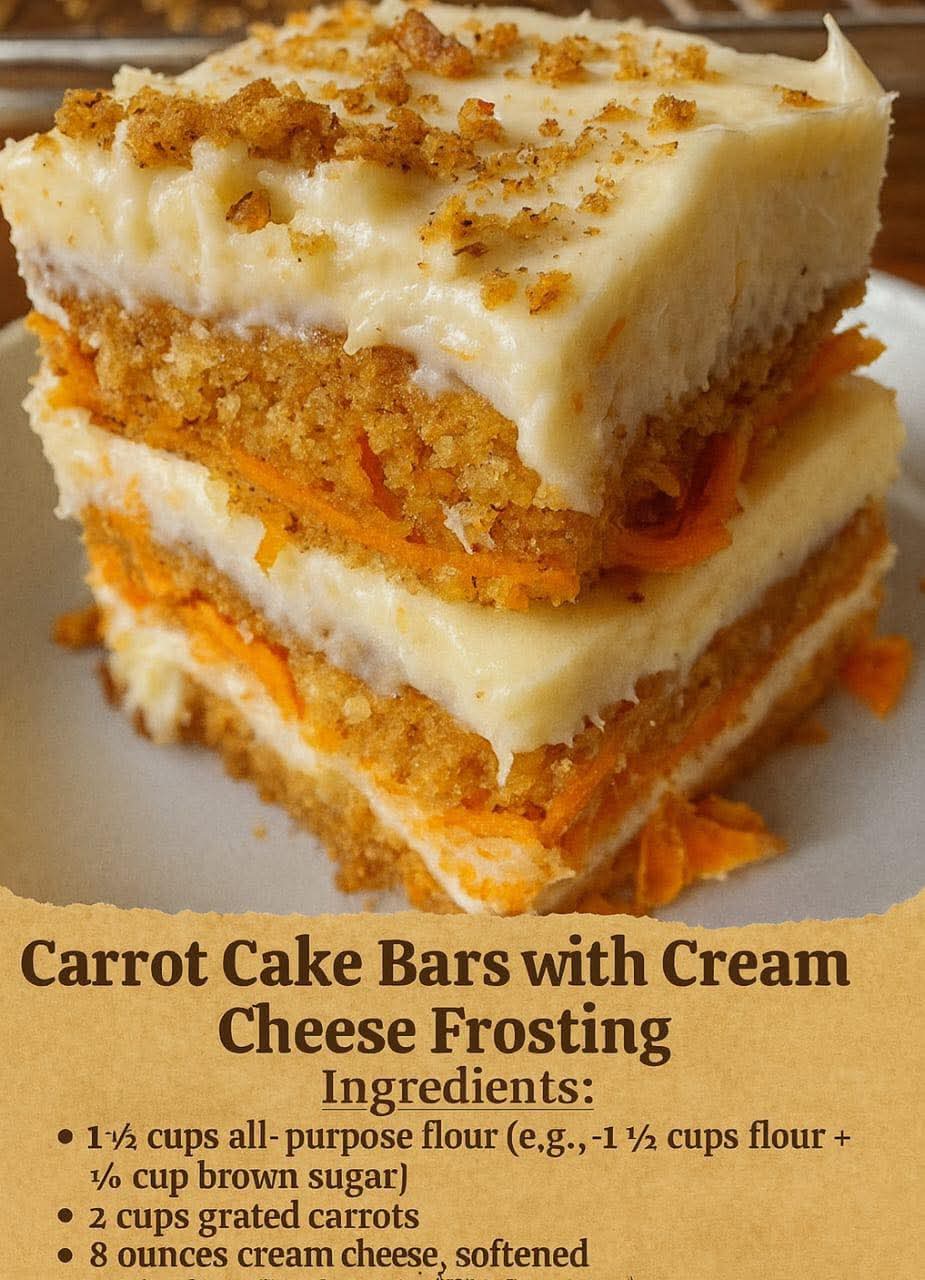 Sure! 🥕 Let’s make this a full, beautiful, and story-filled recipe for Carrot Cake Bars with Cream Cheese Frosting — complete with introduction, history, ingredients, step-by-step instructions, methods, and a sweet conclusion for all carrot cake lovers! 💛
