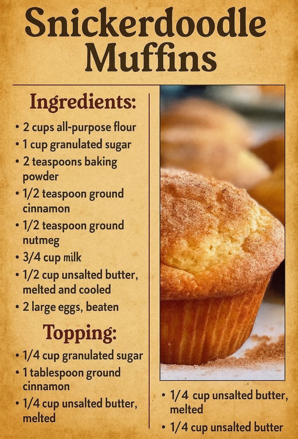Snickerdoodle muffins bring the timeless appeal of the classic cookie into muffin form, offering a soft, cinnamon-kissed bite that will satisfy any sweet tooth. With their sweet topping, moist interior, and the perfect balance of cinnamon and nutmeg, these muffins make an unforgettable treat. Whether you’re enjoying them with a cup of coffee in the morning or sharing them with loved ones, theyāre guaranteed to bring a little joy to your day.