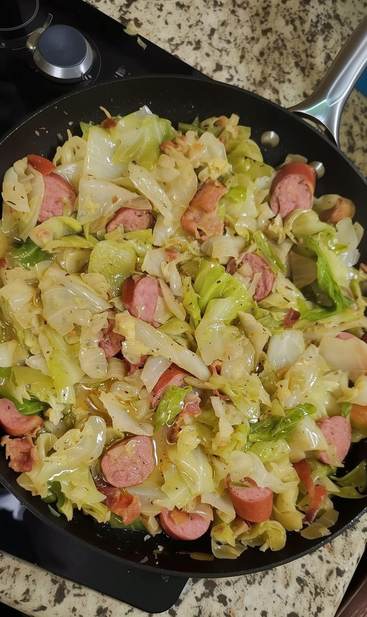 Of course! It sounds like you’ve discovered the magic of cooking with bacon grease—a true game-changer for so many classic, comforting dishes. What you’ve described is a beloved dish that goes by many names: Southern Fried Cabbage, Sautéed Cabbage with Sausage, or as you so perfectly put it, “good old fashioned cabbage.”