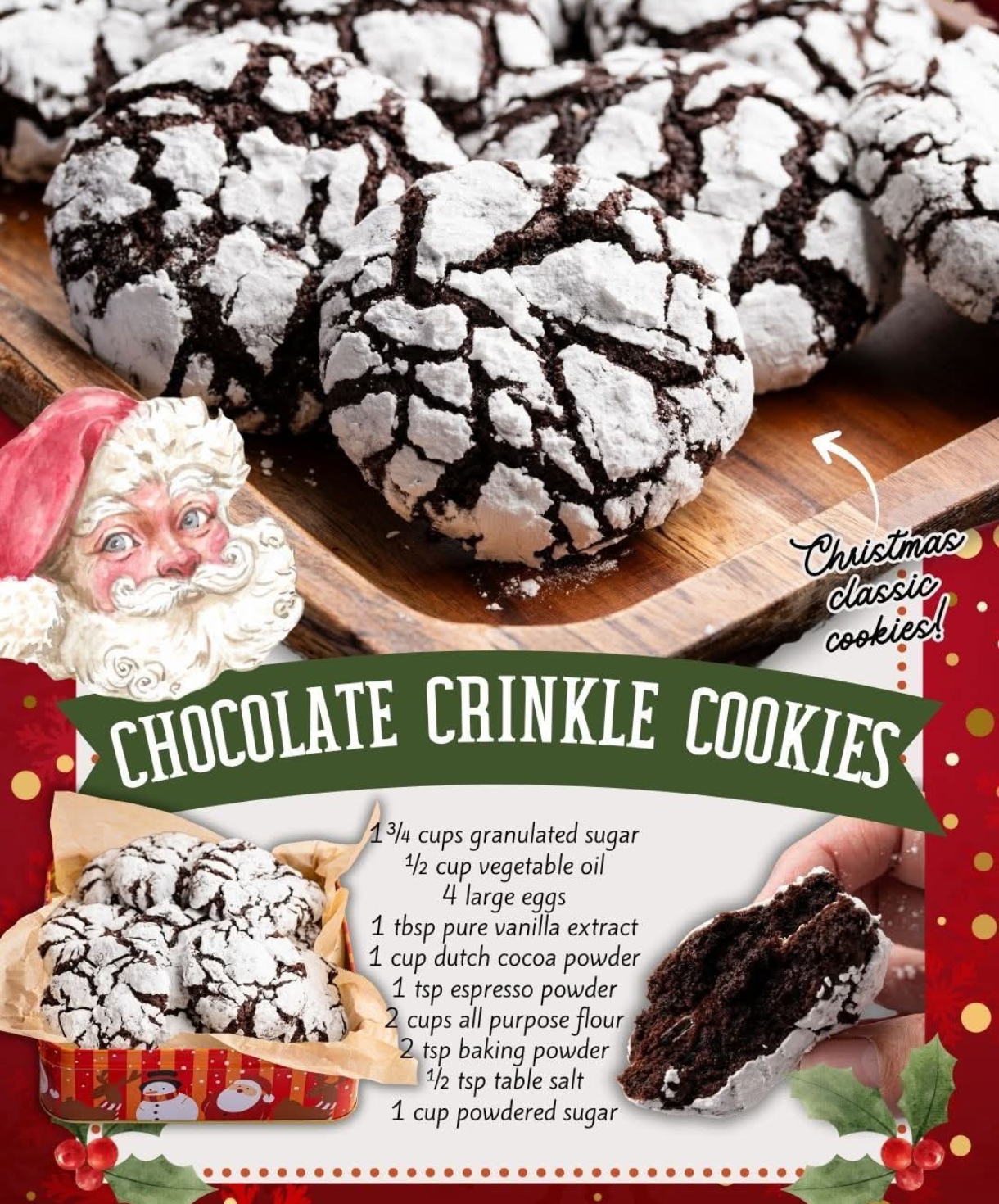 To make around 24 delicious chocolate crinkle cookies, you’ll need the following ingredients: