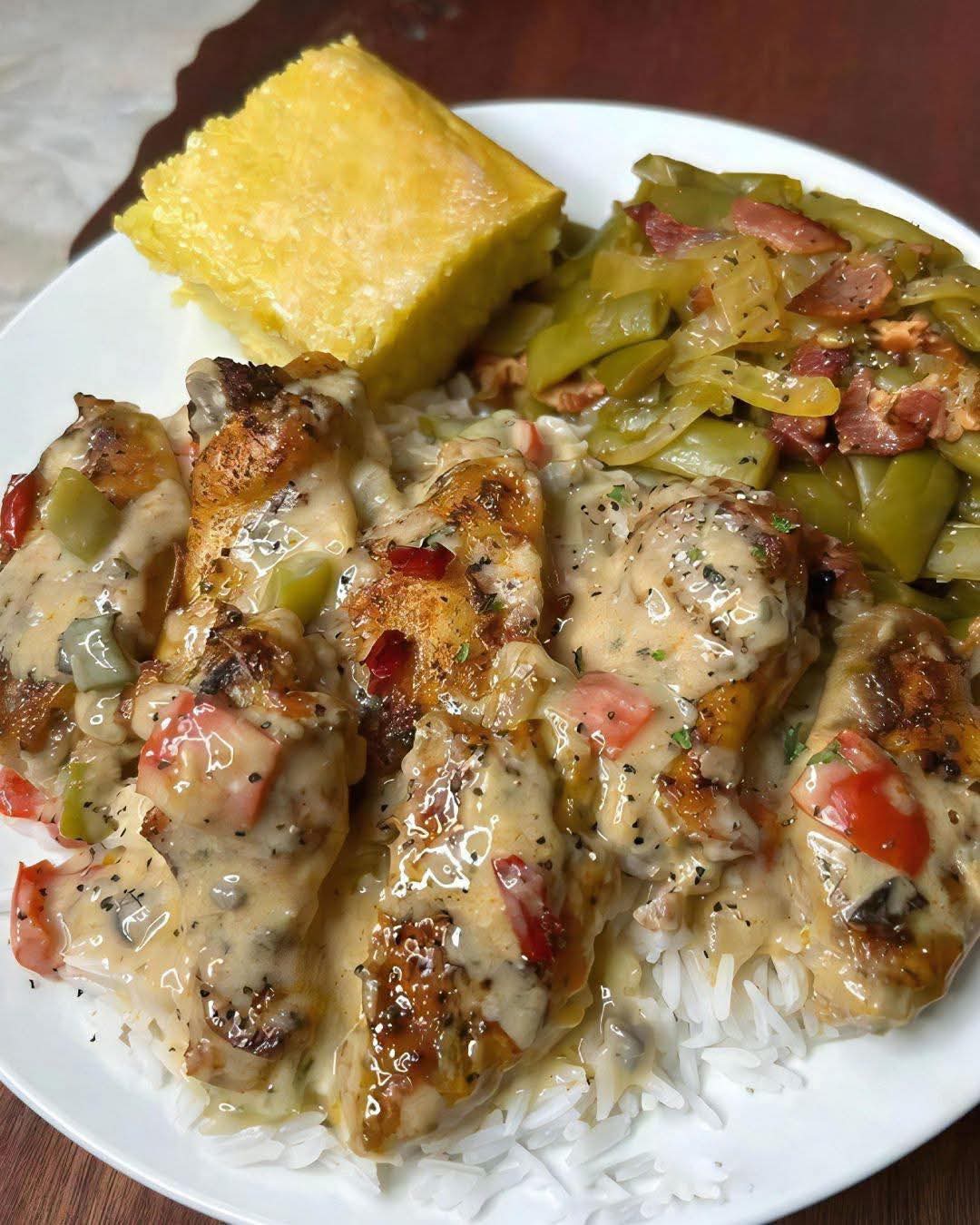 Some meals feel like home the moment they hit the plate—warm, colorful, and deeply comforting. This dish brings together creamy beige chicken simmered with sweet red and green peppers, fluffy white rice, skillet-baked golden cornbread, and buttery green beans. It’s a Sunday-dinner-style feast meant for families, gatherings, and hungry hearts.