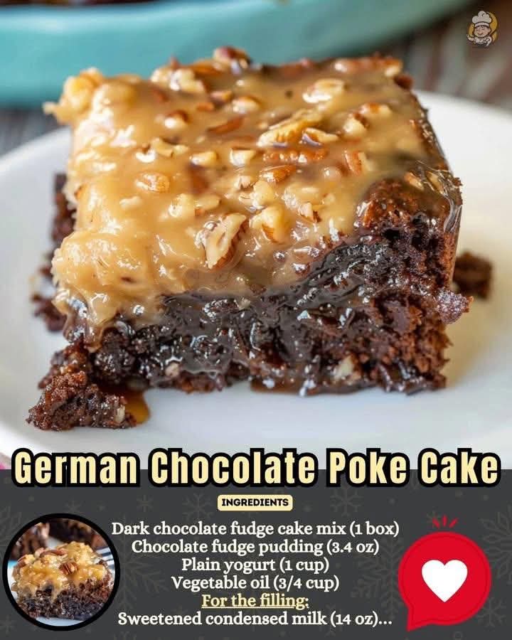 Conclusion: This chocolate poke cake is a celebration of all things chocolate and indulgence. The combination of moist cake, gooey chocolate syrup, and the rich coconut-pecan topping creates a dessert that’s beyond words. Whether it’s for a special occasion, a holiday gathering, or just because you’re craving something sweet, this cake will be the star of the show. It’s the perfect treat for chocolate lovers—and if you don’t love chocolate yet, this cake will definitely win you over.