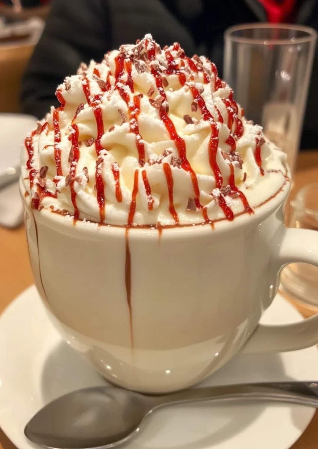 Sipping this luxurious drink is like wrapping yourself in a soft, fuzzy blanket with a hot cocoa kiss. And when it’s topped with whipped cream, a swirl of red syrup, and a sprinkling of sweet snow (aka powdered sugar), it becomes even more magical.