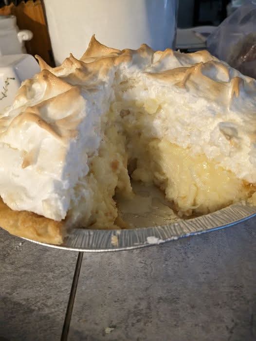 The soft curls of coconut whisper sweetness, the custard embraces with warmth, and the golden meringue glows like a sunset shared between two hearts.