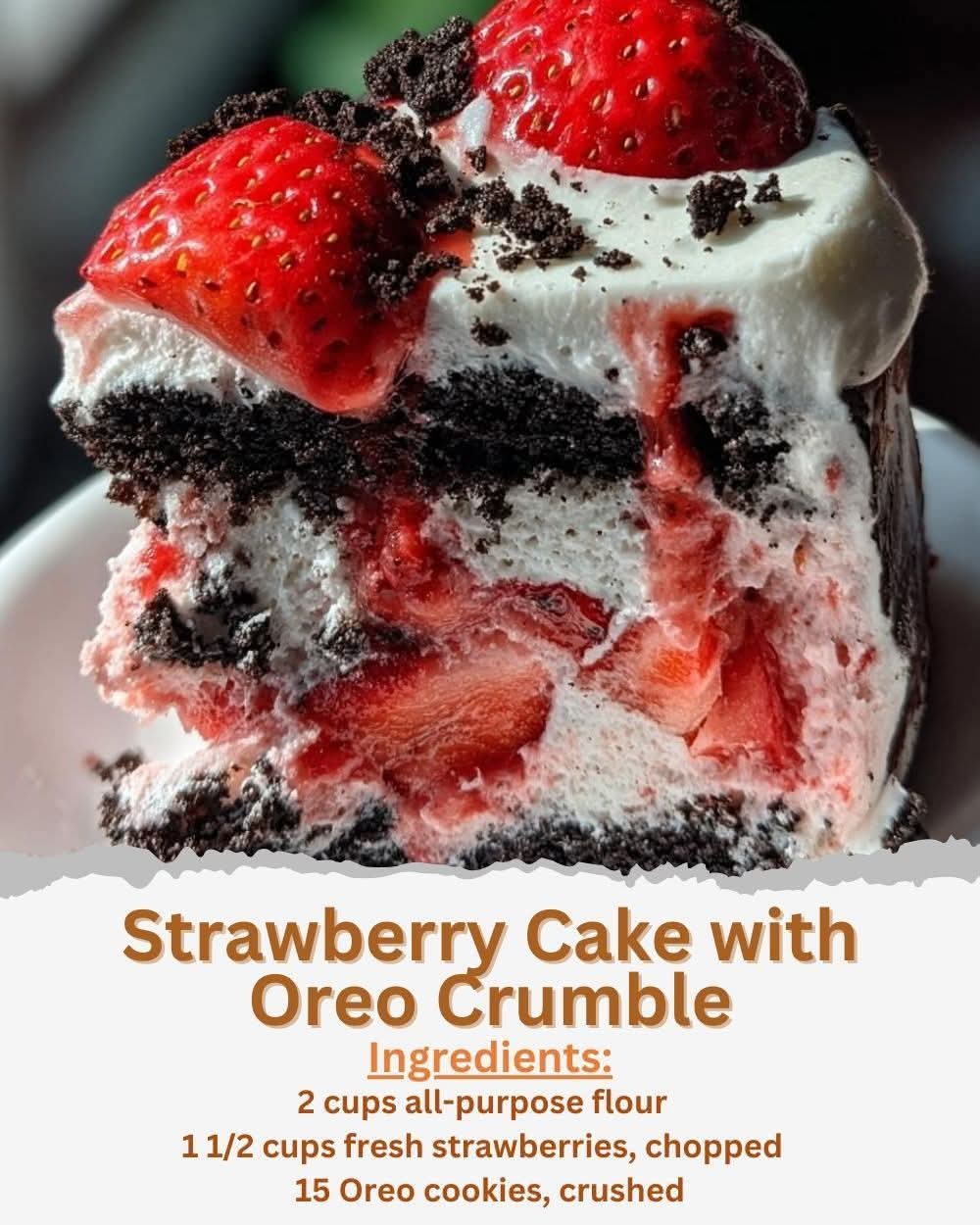 Conclusion: Strawberry Cake with Oreo Crumble is an irresistible combination of fluffy, fruity sweetness and crunchy, chocolaty goodness. It’s an ideal dessert for summer gatherings, birthdays, or any celebration where you want to impress your guests with something a little different. The cake itself is tender and flavorful, and the Oreo crumble gives it that extra bit of indulgence that makes it truly special.