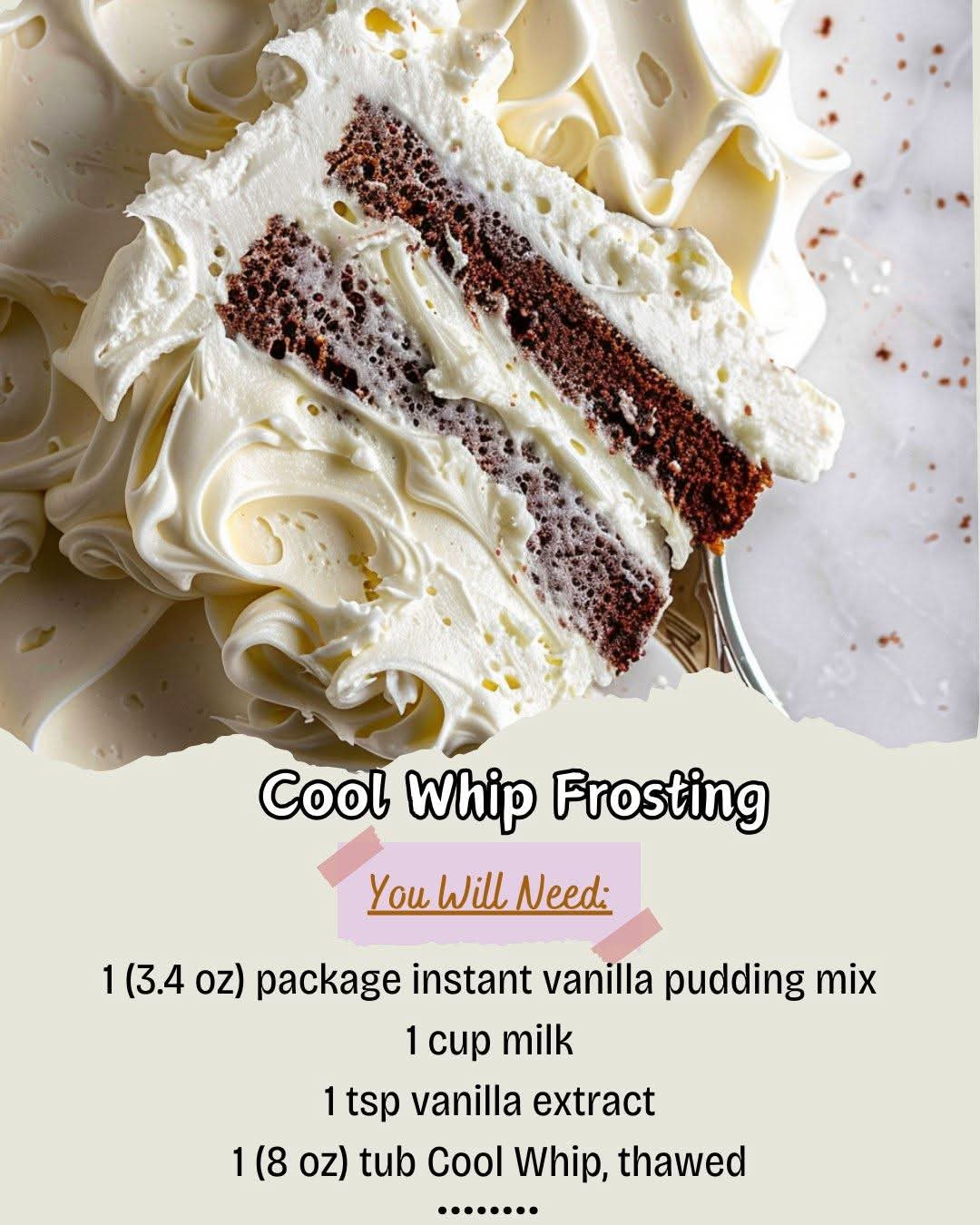 Cool Whip Frosting is formed by a combination of instant pudding mix and Cool Whip, which helps the pudding set while keeping the frosting light and airy. The key to the perfect texture lies in the folding process—ensuring that the Cool Whip is incorporated without deflating it. The result is a smooth, soft frosting that pairs beautifully with a variety of cakes, cupcakes, and other desserts. Adding powdered sugar or vanilla extract helps balance the sweetness and flavor, while the chill time solidifies the frosting into the perfect consistency for spreading.