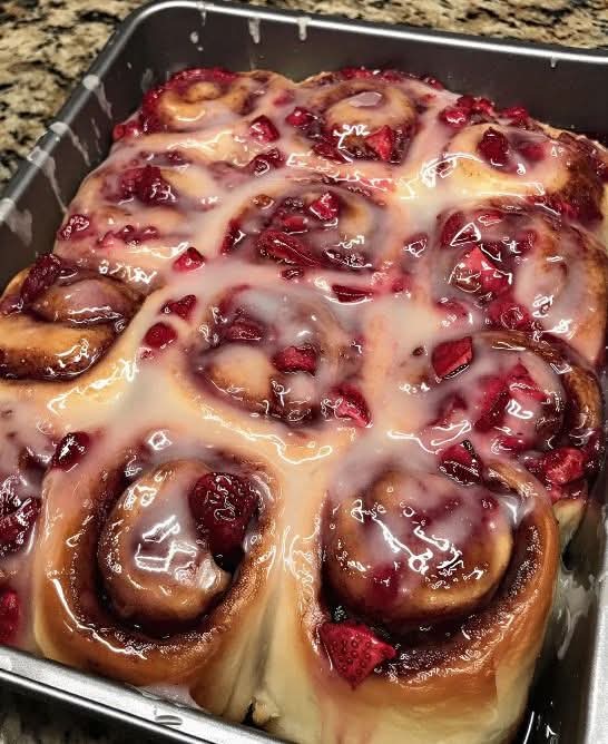 Cinnamon rolls have deep roots in European baking traditions, especially in Scandinavian countries, where enriched doughs were rolled with sugar and spice for special occasions. Over time, American country kitchens made them their own—bigger, softer, sweeter. Adding fresh strawberries is a rustic twist, inspired by summer harvests and farmhouse baking, when fruit was folded into everything from pies to breads to make the most of the season.