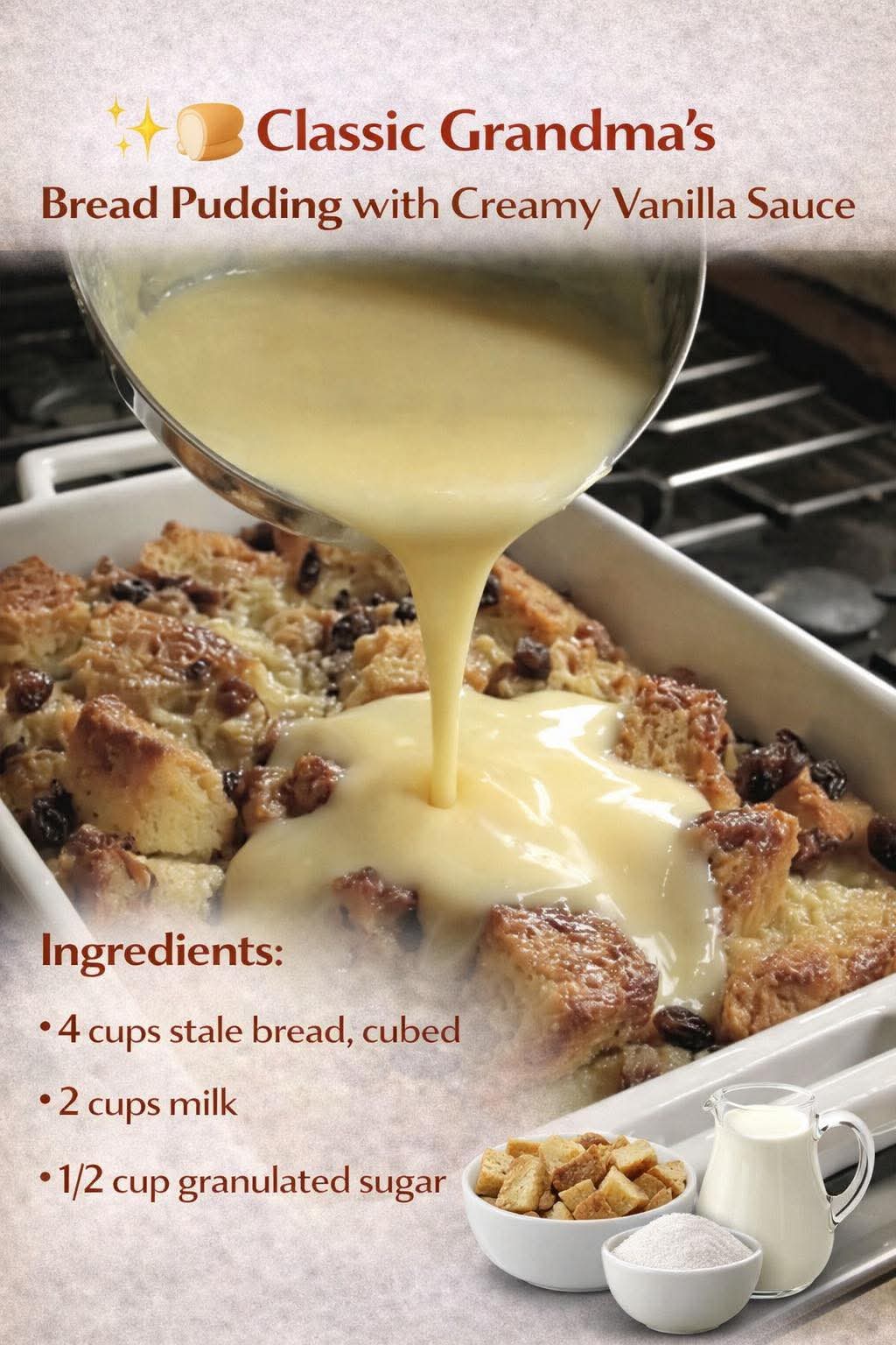 ✨ Classic Grandma’s Bread Pudding with Creamy Vanilla Sauce ✨