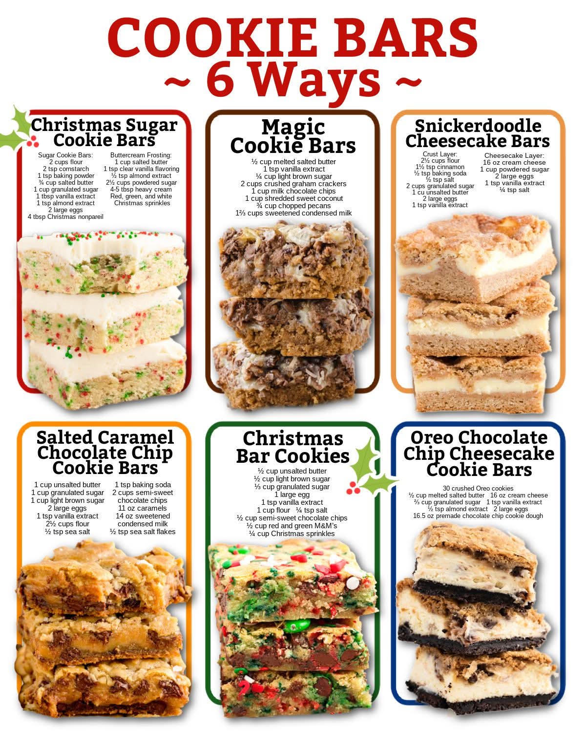 Cookie bars are more than dessert — they’re emotion in edible form. They travel well, slice beautifully, and turn simple ingredients into unforgettable moments. Whether you crave festive sparkle, gooey indulgence, or creamy layers, these six cookie bars cover every mood and every sweet tooth.