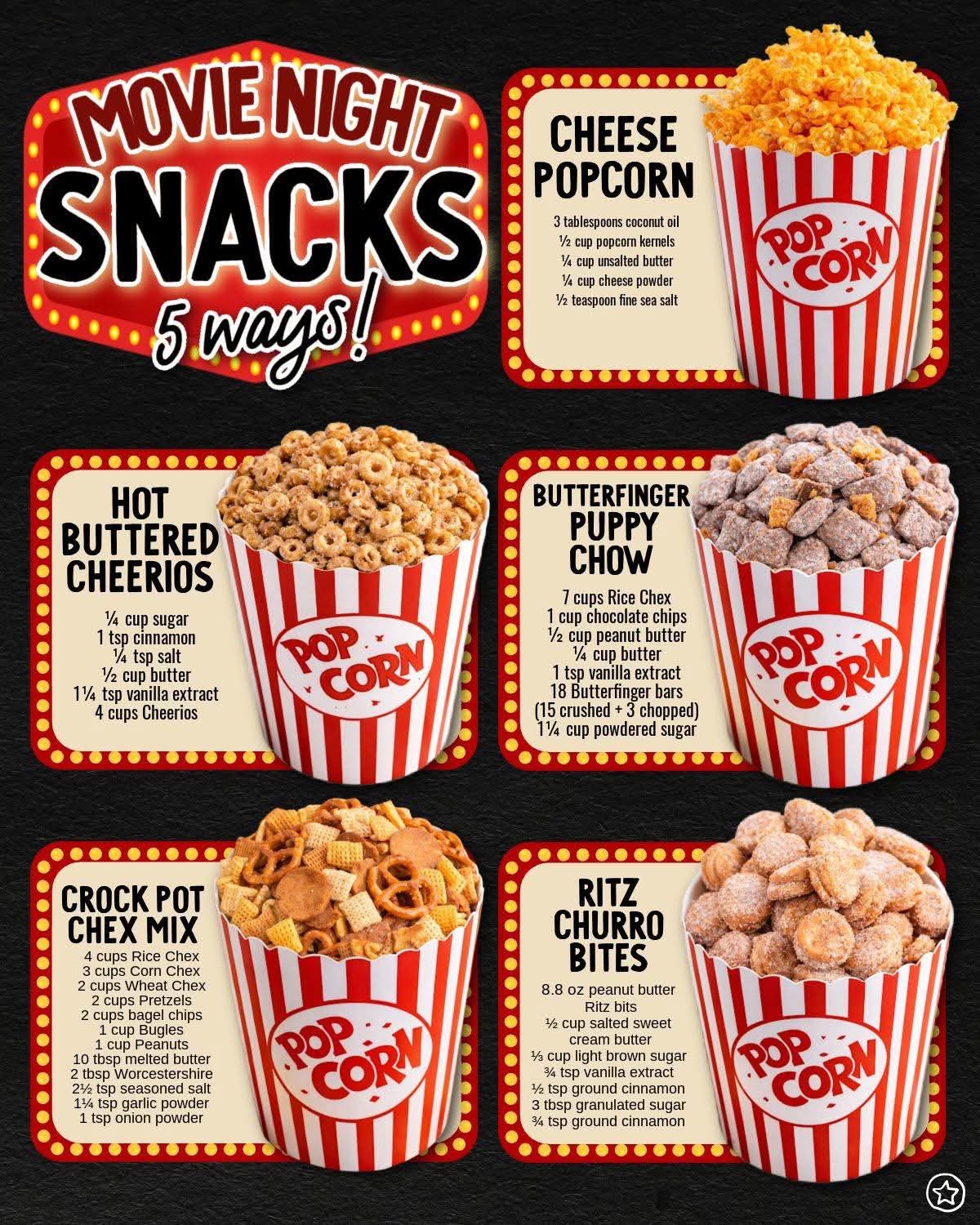 From cheesy popcorn to sweet, crunchy puppy chow and buttery cinnamon bites, this movie-night spread has something for every craving — sweet, salty, crunchy, buttery, and totally irresistible.