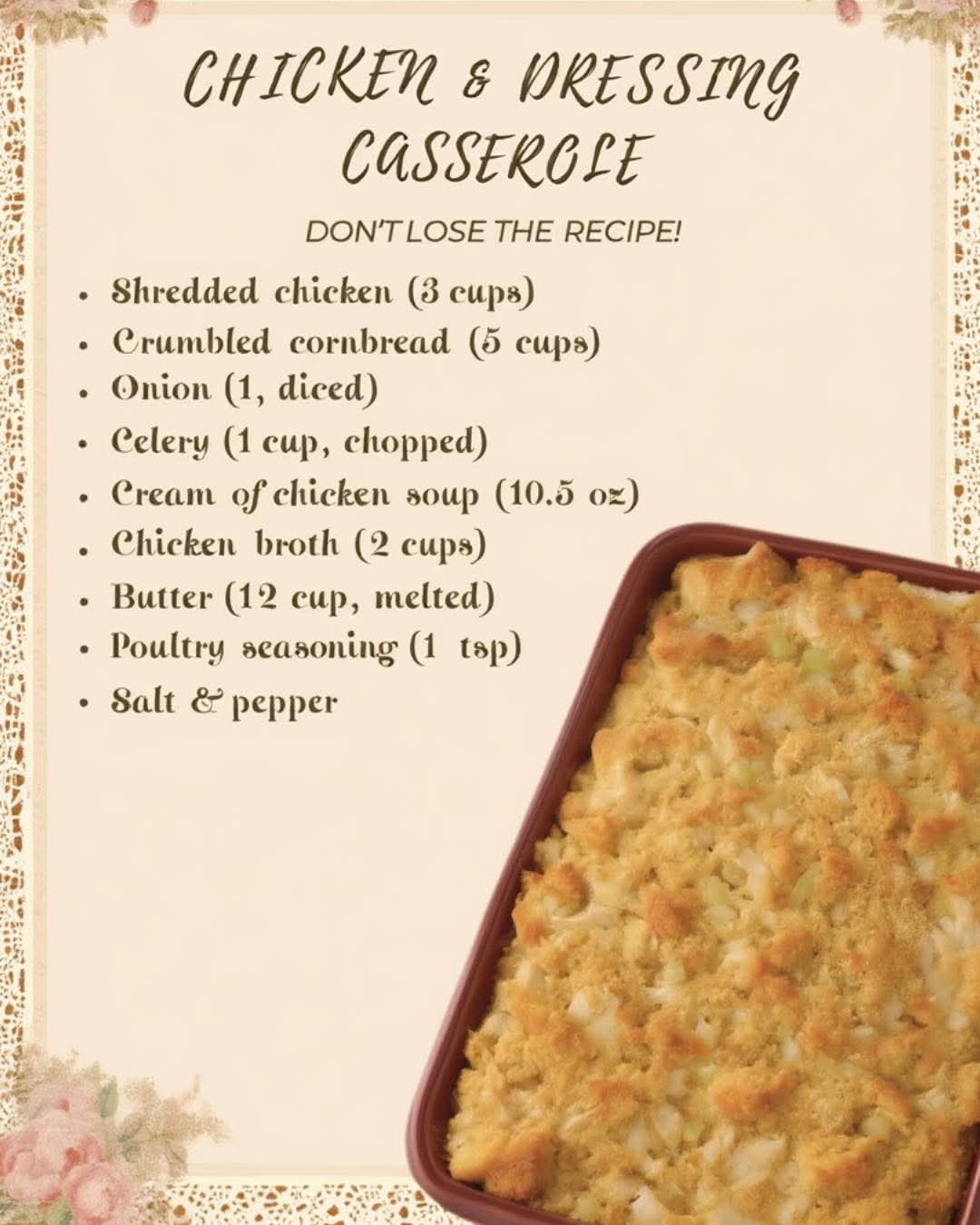 Chicken and Dressing Casserole is more than a recipe — it’s a memory on a plate. Warm, savory, and deeply comforting, it’s the kind of dish that brings people together and makes a house feel like home. One bite, and you’ll understand why this Southern classic has been loved for generations.