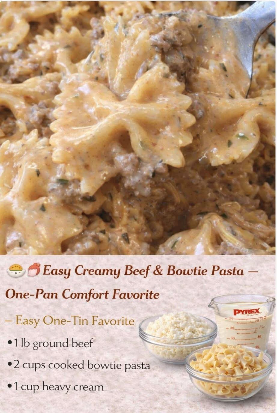 If comfort food had a love language, this dish would be speaking it fluently. Creamy, hearty, and deeply satisfying, Creamy Beef & Bowtie Pasta is the kind of meal that brings everyone to the table fast. Made in one pan with simple pantry ingredients, it delivers rich flavor, tender pasta, and savory beef in every bite β all with minimal cleanup. Perfect for busy weeknights, cozy weekends, or whenever you want something warm and indulgent without stress.