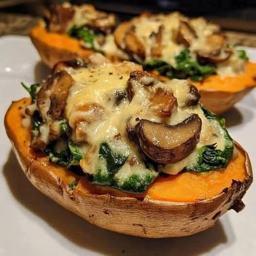 2. Combine & Fill: Gently fold the sweet potato flesh into the creamy spinach and mushroom mixture until everything is well incorporated. Taste and adjust seasoning. Spoon this filling generously back into the sweet potato shells, mounding it slightly.