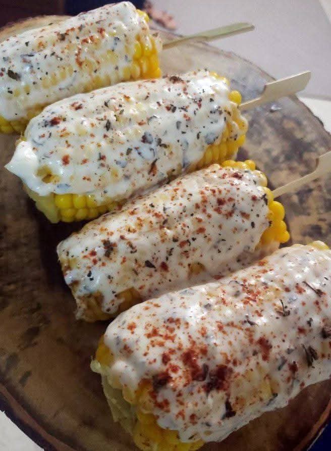 - Using a spoon or brush, slather the creamy sauce all over each grilled ear of corn.