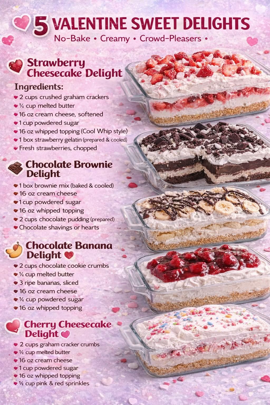 These desserts are inspired by classic American layered “delight” desserts from the 1950s–1980s — when cream cheese, whipped topping, and pudding became household favorites. Over time, these simple layered treats turned into party staples for holidays, potlucks, and romantic celebrations.