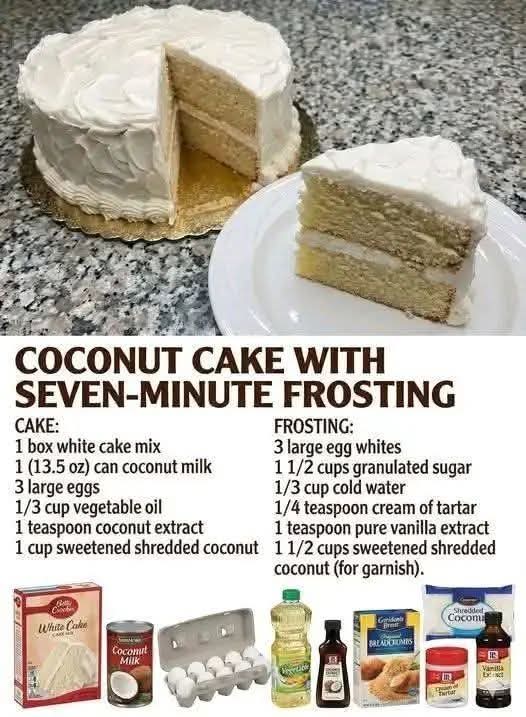 Some recipes are more than instructions; they are memories written in sugar and butter. This Coconut Cake with Seven-Minute Frosting is one such recipe. It is the taste of golden anniversaries, Easter Sundays, and church potlucks where the ladies nod in approval after the first bite. The cake itself is impossibly tender, thanks to coconut milk and sour cream, while the frosting is a billowy cloud—stiff, glossy, and whipped over steam until it holds its peaks like meringue. This is not just a dessert. It is an event.