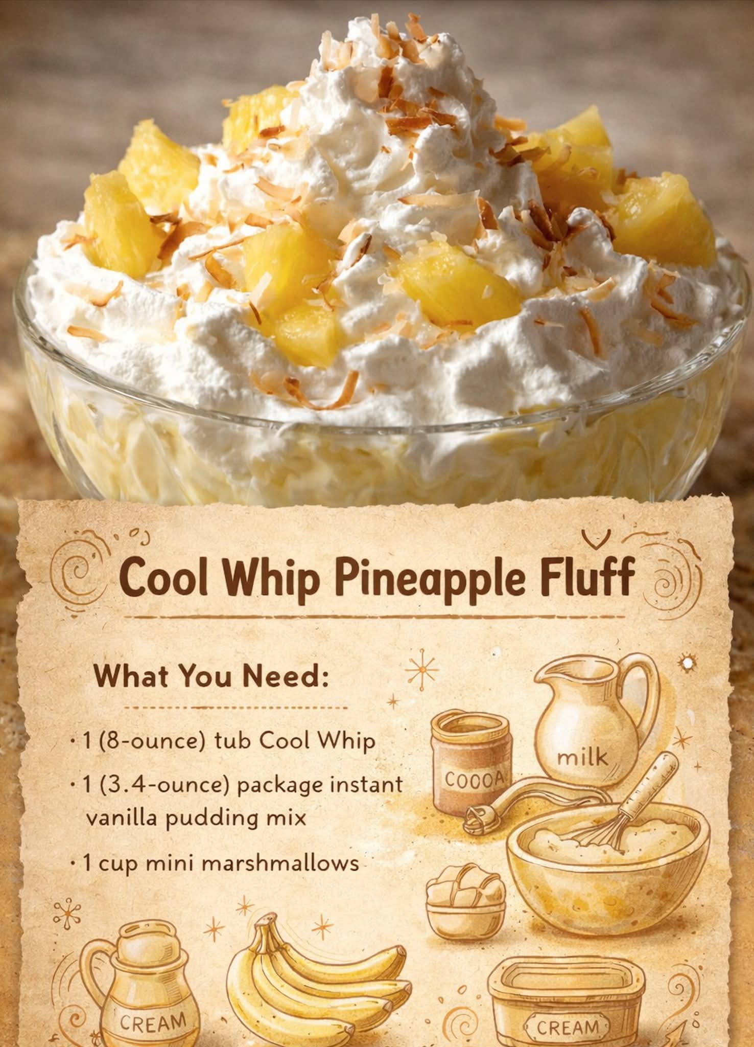Cool Whip Pineapple Fluff isn’t just a recipe — it’s comfort in a bowl. It’s bright, creamy, and nostalgic. The kind of dessert that reminds you of laughter around the table and seconds being quietly scooped.