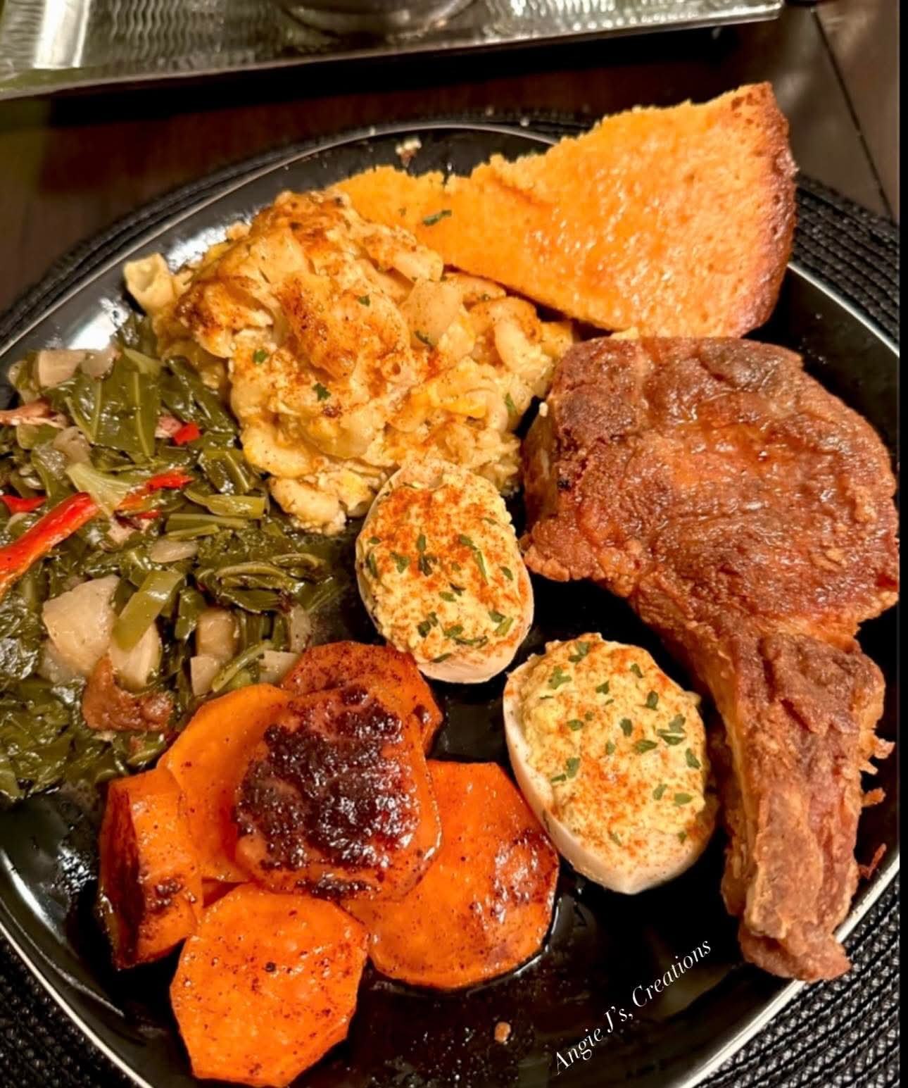 🍴 Deep-Fried Pork Chops with Collard Greens, Mac & Cheese, Deviled Eggs, Candied Yams, and Honey Cornbread
