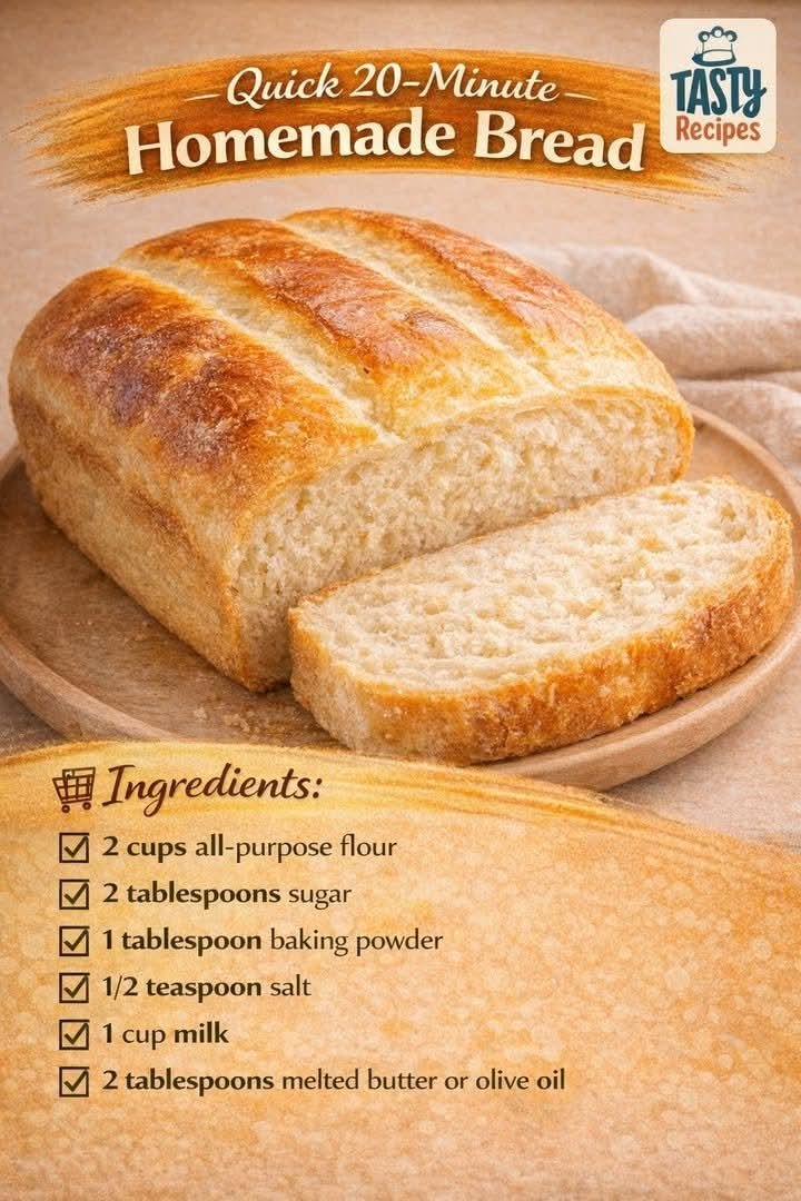 Sometimes you just want fresh, warm bread without waiting hours for dough to rise. This quick homemade bread is soft, slightly sweet, and ready in about 20 minutes—perfect for breakfast, snacks, or alongside your favorite meals.