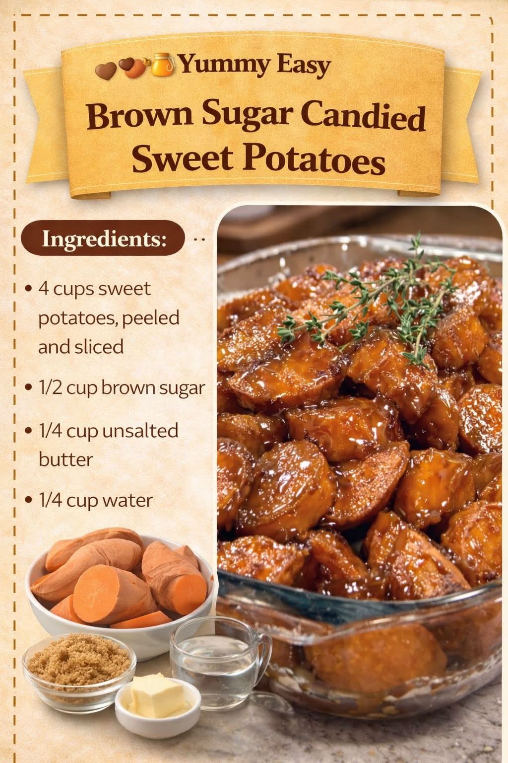 Brown Sugar Candied Sweet Potatoes are more than just a side dish—they’re a warm hug on a plate. Simple ingredients transform into something rich, sweet, and unforgettable. Whether for a festive dinner or a cozy weekday meal, this recipe is guaranteed to become a favorite in your kitchen.