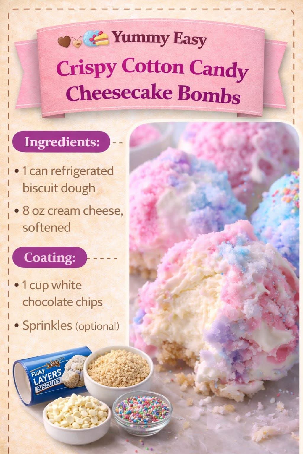 This dessert is inspired by fairground treats, where deep-fried sweets and cotton candy have been favorites for decades. Cotton candy itself became popular in the early 1900s and is known for its light, sugary texture. Combining it with cheesecake and biscuit dough is a modern twist that brings carnival vibes into your kitchen.