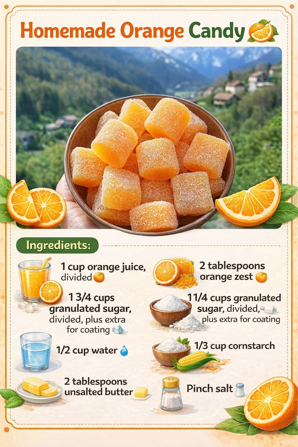 Imagine biting into a candy that carries the sun in its essence: bright, zesty, and irresistibly sweet. These Orange Citrus Chews combine the tangy vibrance of freshly squeezed oranges with the soft, silky texture of a perfectly cooked candy. With a glossy finish, a melt-in-your-mouth chewiness, and the aroma of orange zest that fills the kitchen, these candies aren’t just treats—they’re tiny capsules of happiness. Perfect for gifting, snacking, or savoring with a cup of tea, they are a celebration of citrus in its most delicious form.