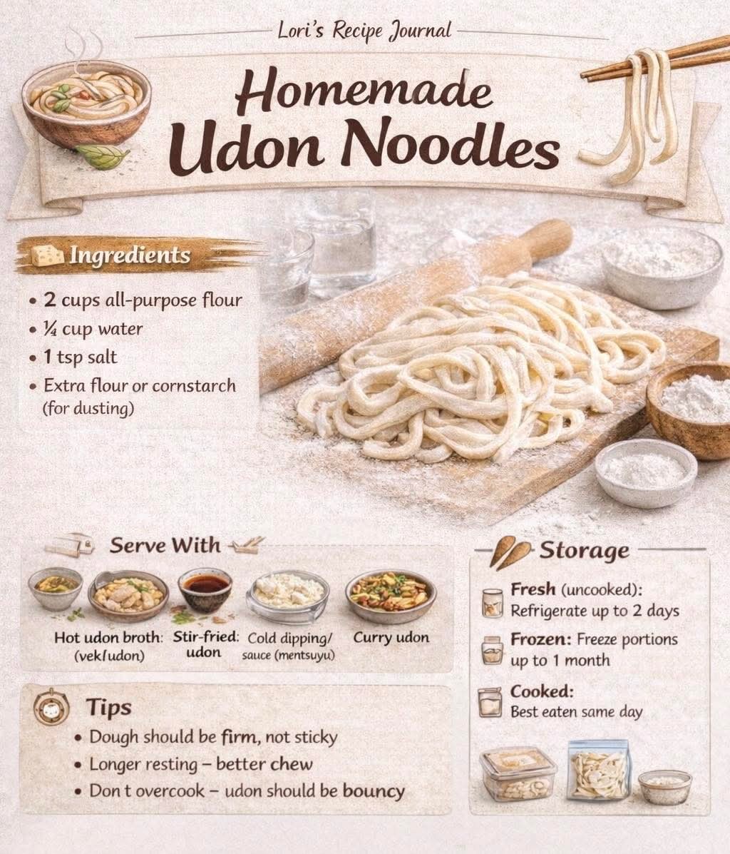 If you want, I can also make a “Udon Masterclass” visual guide, showing traditional kneading with feet, rolling, folding, and plating for authentic Japanese presentation. It would be perfect for sharing or keeping as a reference.