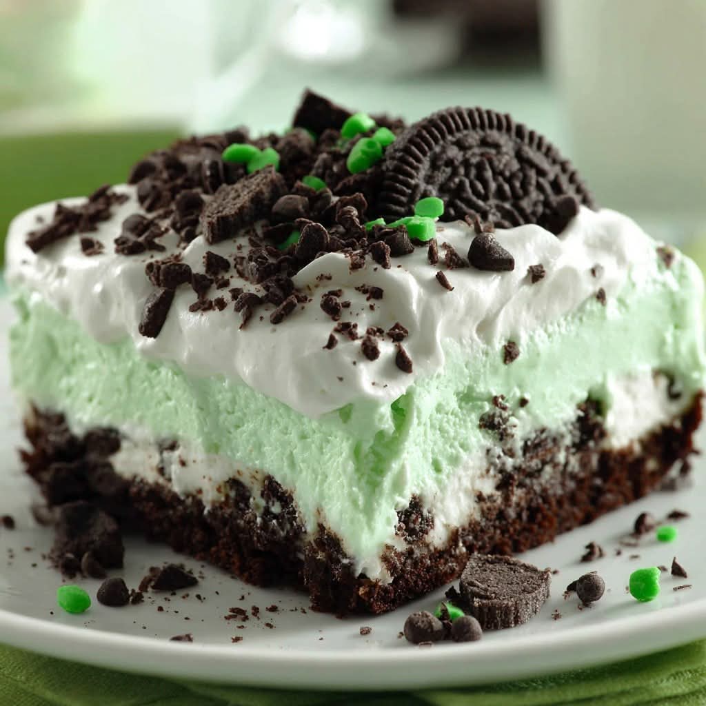 The idea of a layered dessert lasagna originates from traditional Italian lasagna, which inspired sweet dessert versions in the United States. In this case, the Shamrock Shake—a seasonal minty milkshake popularized by fast-food chains—was adapted into a layered dessert, making it portable, sliceable, and perfect for festive celebrations. The combination of Oreo crust, creamy cheesecake, and minty pudding reflects modern dessert trends of playful flavors and textures.