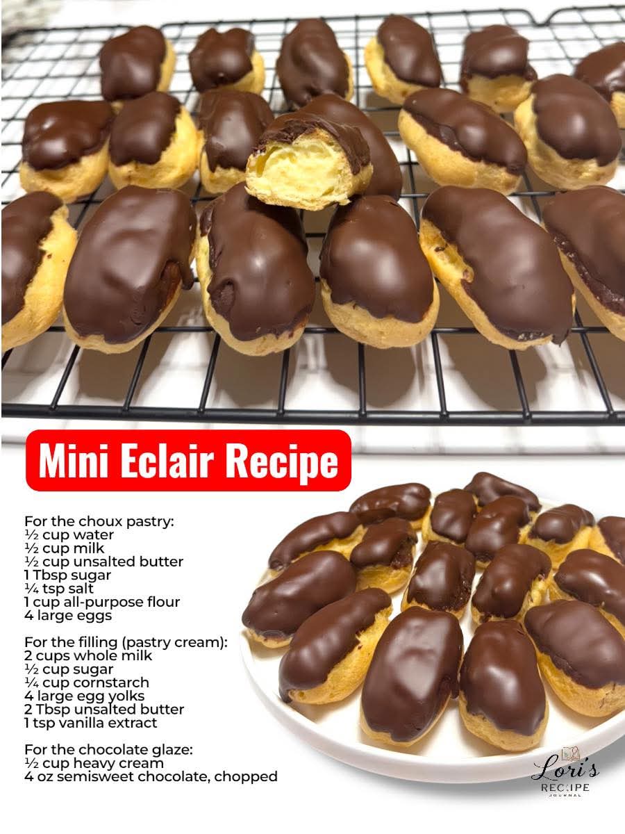 Mini eclairs are delicate, airy pastries that have captivated dessert lovers for centuries. Originating in France, the eclair has long been a symbol of elegance, served at patisseries and afternoon teas alike. These bite-sized versions are perfect for parties, tea-time treats, or even a fancy dessert platter. Filled with smooth, velvety pastry cream and topped with a glossy chocolate glaze, each eclair is a miniature masterpiece—crispy on the outside, creamy on the inside, and utterly irresistible.