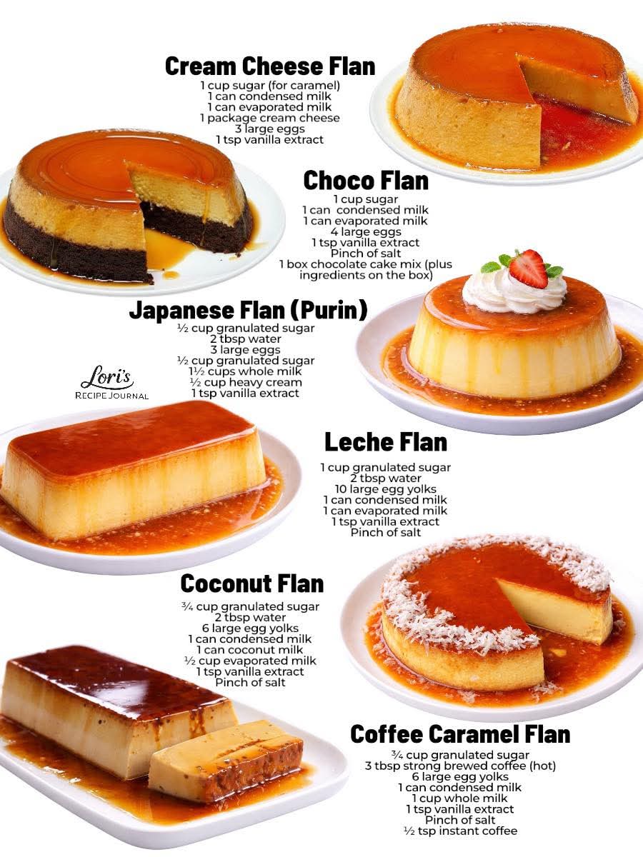 If you want, I can also create a visual “flan family chart” showing all six types, layers, and flavor notes—a beautiful kitchen reference to make them all at once!