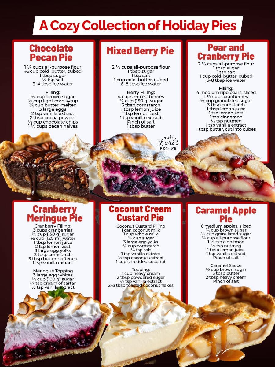 A holiday pie isn’t just dessert — it’s tradition, comfort, and love baked into a flaky crust. Whether you prefer chocolate richness, fruity brightness, silky custard, or gooey caramel, this collection gives you a full festive dessert table in one guide.