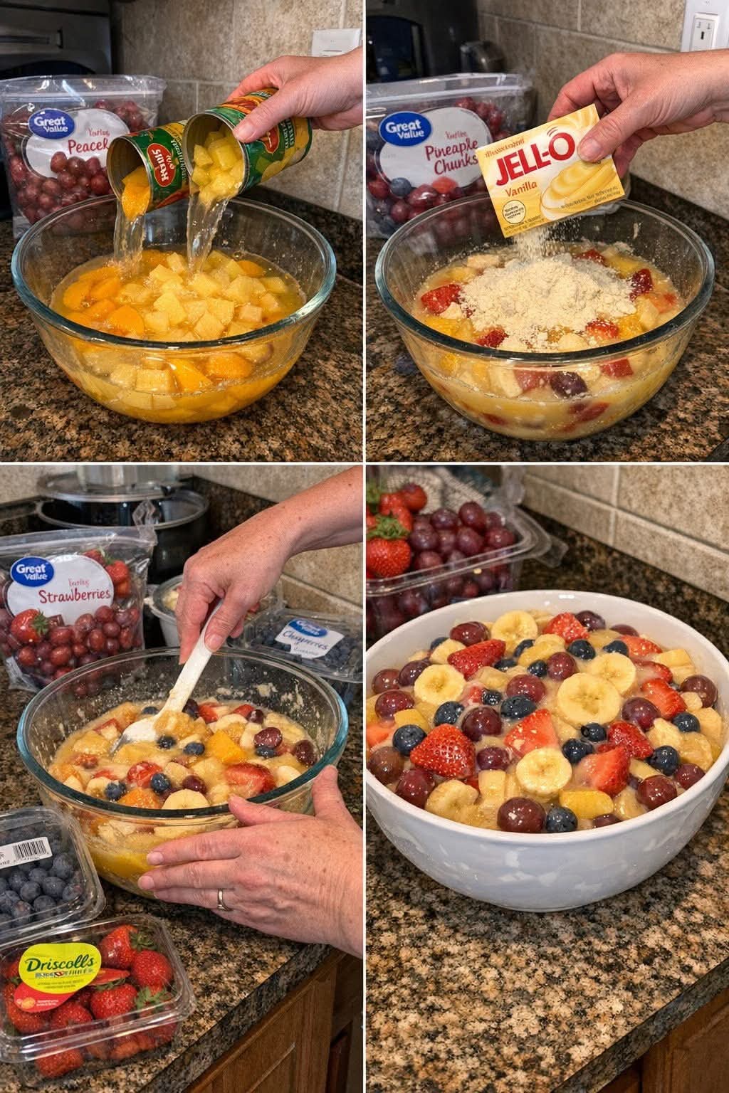 Instead of whipped toppings or marshmallows, this version uses instant vanilla pudding powder to naturally thicken the fruit juices into a smooth glaze. The result? A glossy, creamy coating that hugs every strawberry, banana slice, and grape.