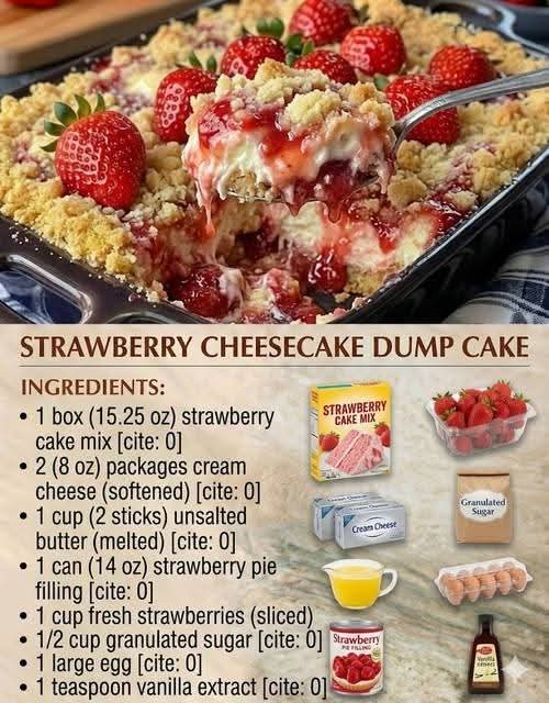 The Strawberry Cheesecake Dump Cake is more than just a recipe; it’s a testament to the beauty of simplicity in the kitchen. It proves that you don’t need hours of prep or professional skills to create a dessert that is both deeply comforting and wonderfully impressive . With its luscious layers of fruit, cream cheese, and buttery crumb, it’s a guaranteed hit for any occasion, from casual family dinners to festive holiday gatherings . So, the next time you need a surefire way to bring a smile to the table, remember this recipe. Dump, bake, and watch the magic—and the love—unfold .