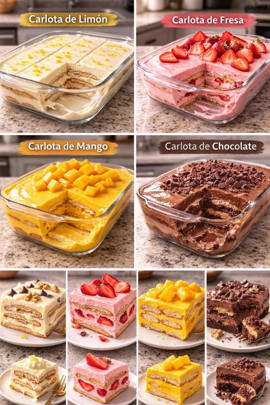 If you want, I can also make a visual “step-by-step” guide showing all four Carlotas with their layers and garnishes—it makes it perfect for sharing or saving in your recipe book.