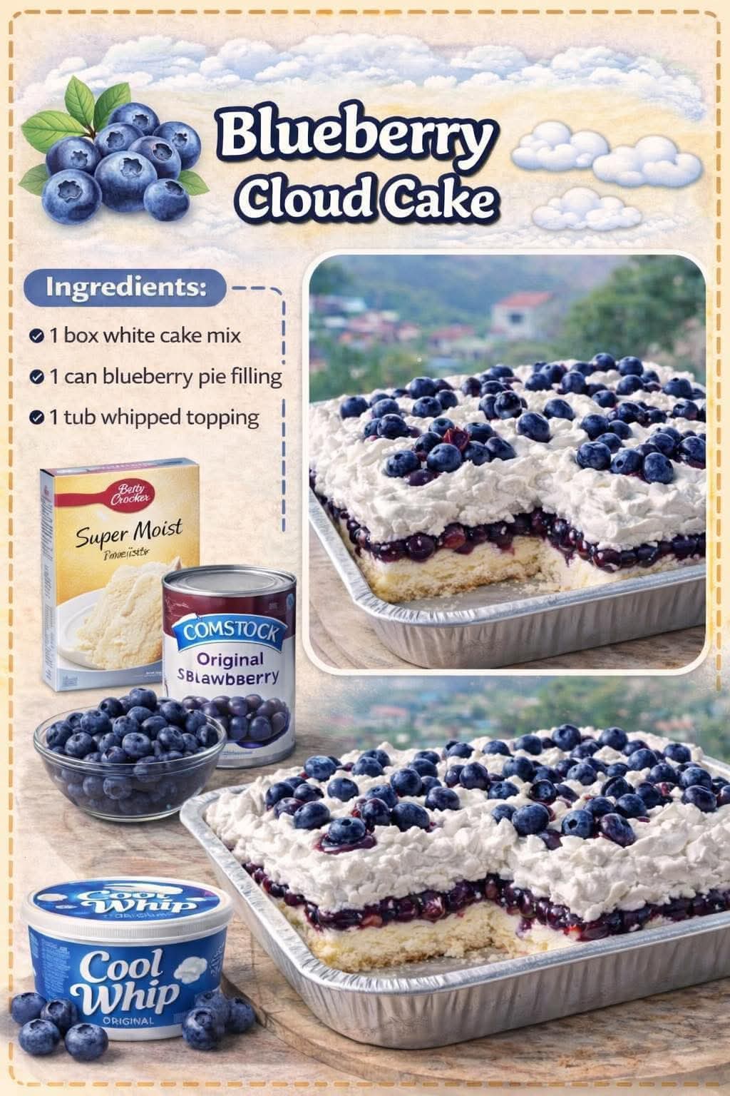 Blueberry Cloud Cake is a simple yet elegant dessert that combines fluffy vanilla cake, sweet blueberry filling, and creamy whipped topping. Its light texture and bright fruity flavor make it perfect for any occasion.