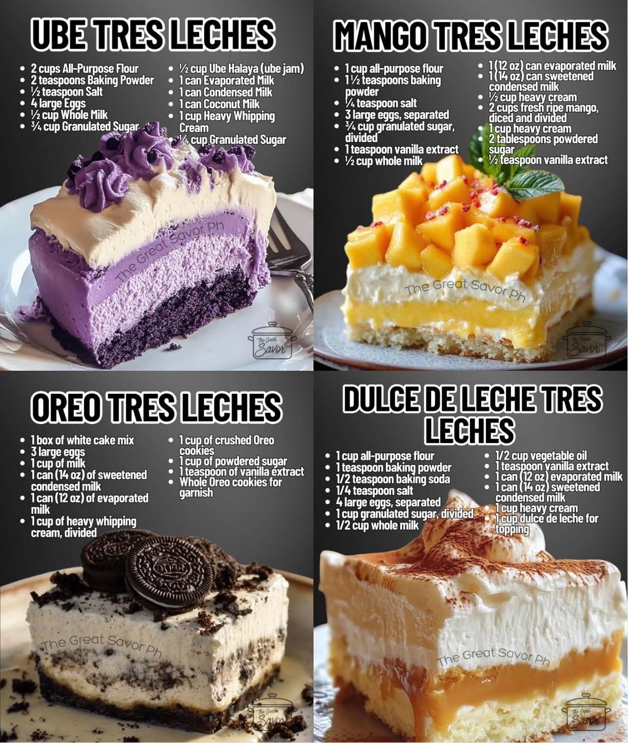 If you want, I can also combine all four variations into a single “Mega Tres Leches Cake” recipe where each layer has a different flavor—like ube, mango, Oreo, and dulce de leche—so you get the ultimate layered masterpiece.