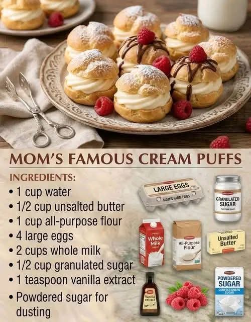 Few desserts feel as magical as a tray of warm, golden cream puffs fresh from the oven. Crisp on the outside and light as air on the inside, these delicate pastries are filled with sweet cream that melts in your mouth. Many families pass down their cream puff recipes from generation to generation, and “Mom’s Famous Cream Puffs” is exactly that kind of treasured recipe.
