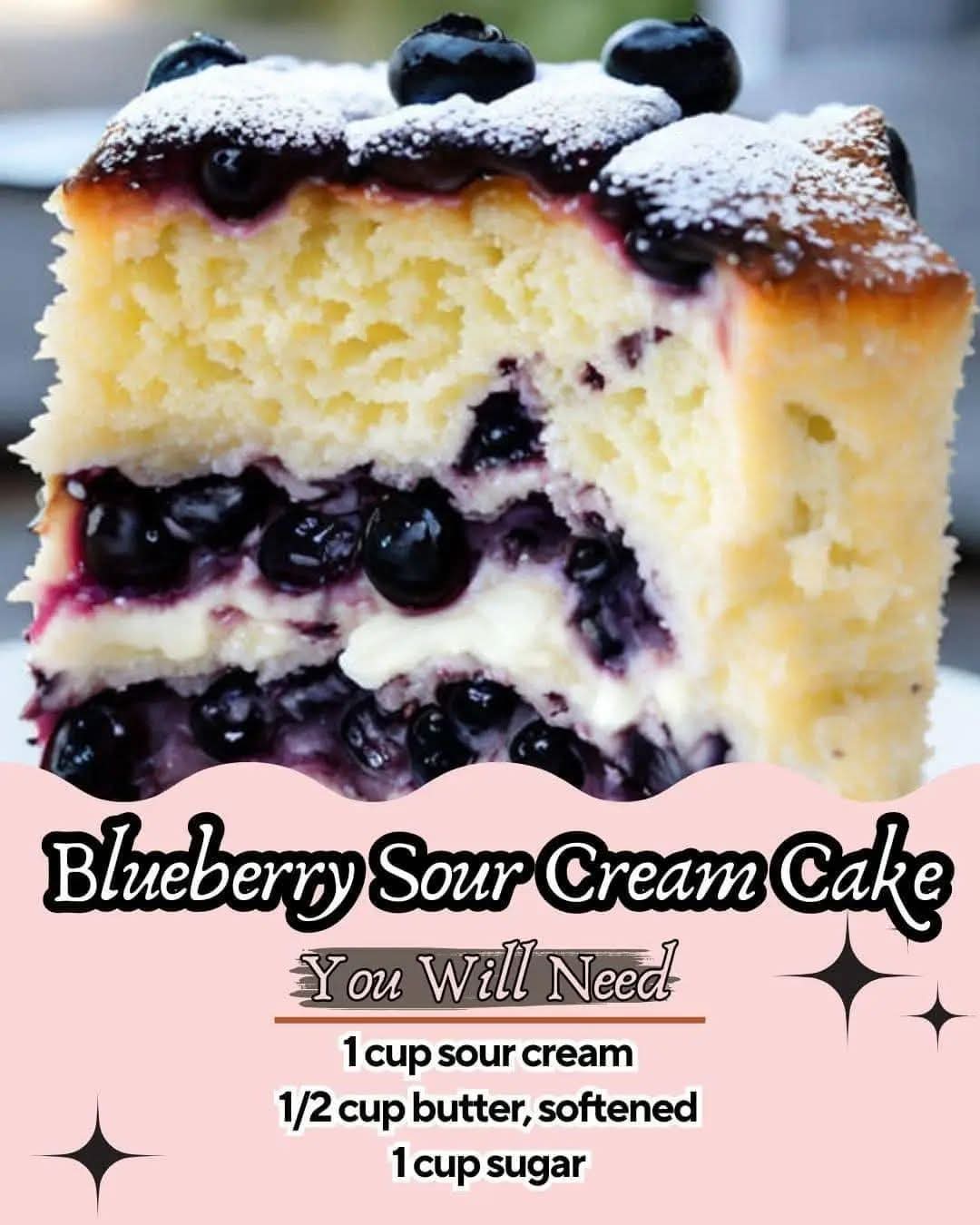 Sour cream cakes have deep roots in European and American baking traditions. Sour cream adds moisture, tang, and tenderness, allowing cakes to stay fresh longer without compromising flavor. Blueberries, native to North America, have been cherished since colonial times. Combining sour cream and blueberries in a cake became popular in American homes during the 20th century, often featured in church bake sales, family gatherings, and afternoon teas. The cake’s light crumb, subtle tang, and fruity burst reflect the ingenuity of home bakers who valued both taste and texture.