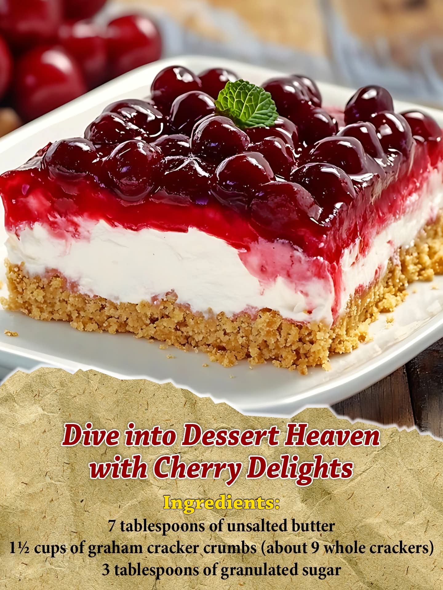 Cherry Delight is proof that a simple recipe can create a truly memorable dessert. With its buttery graham cracker crust, fluffy cream filling, and sweet cherry topping, every bite delivers a perfect balance of flavor and texture.