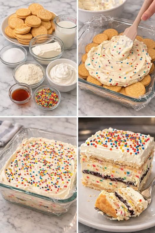 A birthday cake doesn’t always need an oven to be unforgettable! This No-Bake Birthday Cake is a dreamy, creamy dessert layered with crushed vanilla sandwich cookies and a luscious pudding–cream cheese filling. It’s perfect for hot days, quick celebrations, or when you want something fun, colorful, and effortless. Think of it as a mix between an icebox cake and a classic birthday cake—soft, sweet, and irresistible.