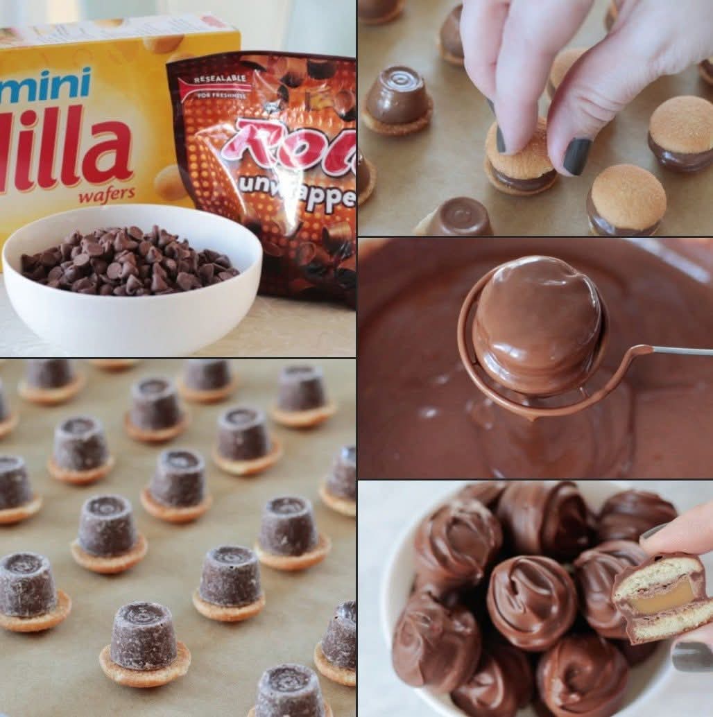 - Remove from oven and top each Rolo with another Nilla wafer cookie.