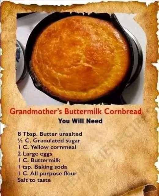Grandmother’s Buttermilk Cornbread is more than just a recipe—it’s a memory, a tradition, and a taste of home. Whether served with a hearty meal or enjoyed on its own with butter and honey, it never fails to bring warmth and comfort. One bite, and you’ll understand why it has stood the test of time.