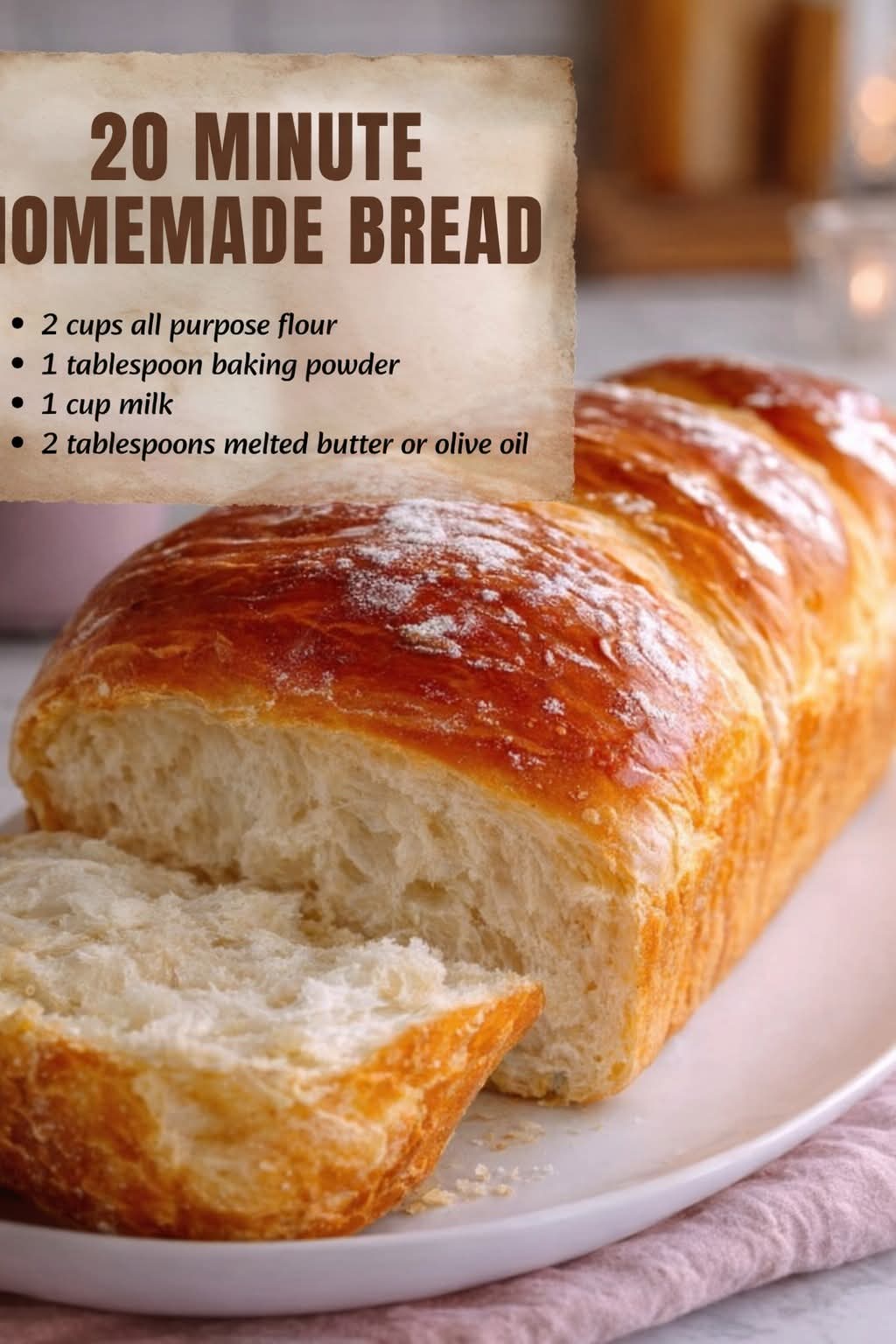 Imagine the aroma of freshly baked bread filling your kitchen, soft, golden, and ready in just 20 minutes. No yeast, no waiting, just a simple, quick, and satisfying bread that pairs beautifully with butter, jam, or your favorite savory spread. This easy recipe is perfect for busy mornings, last-minute meals, or anyone craving the comfort of homemade bread without the long rise time.